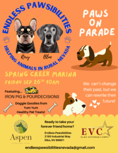 Elko Veteran Corps is partnering with Endless Pawsibilities on September 26th to host PAWS ON PARADE – a pet adoption event!